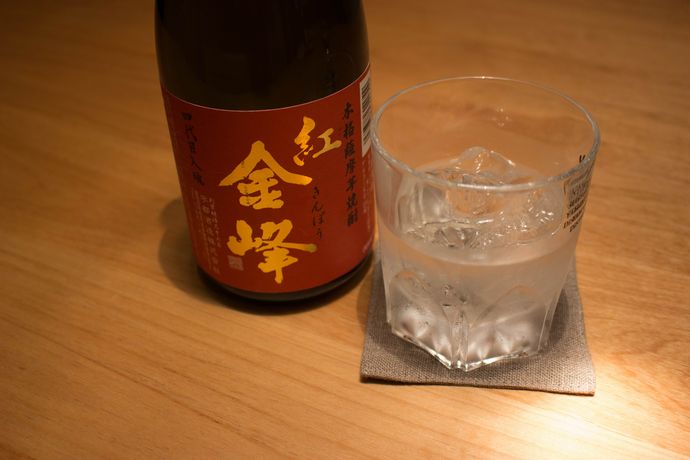 いつも購入するプロの酒店の方に「水割りやロックで美味しいのは?」と伺ったところ、「だったら紅芋を使ったこの焼酎ですね!」と、おすすめされたのが、今回ご紹介する「金峰紅」です。(*^▽^*)