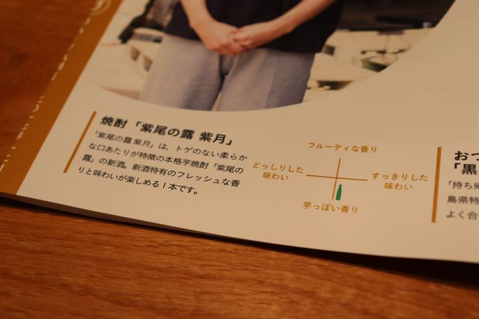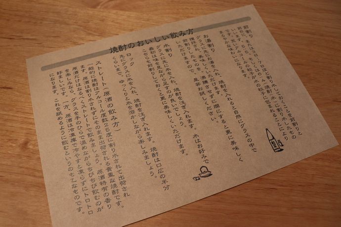 毎月一回、焼酎唎酒師の酒屋店主さんが季節や生産時期に応じた焼酎を厳選セレクト。造り手の想いや、届けられた焼酎の美味しい飲み方を伝授してくれる冊子。さらにはおつまみとそのアレンジ方法も紹介されたかゆいところに手が届く素晴らしいサービス!