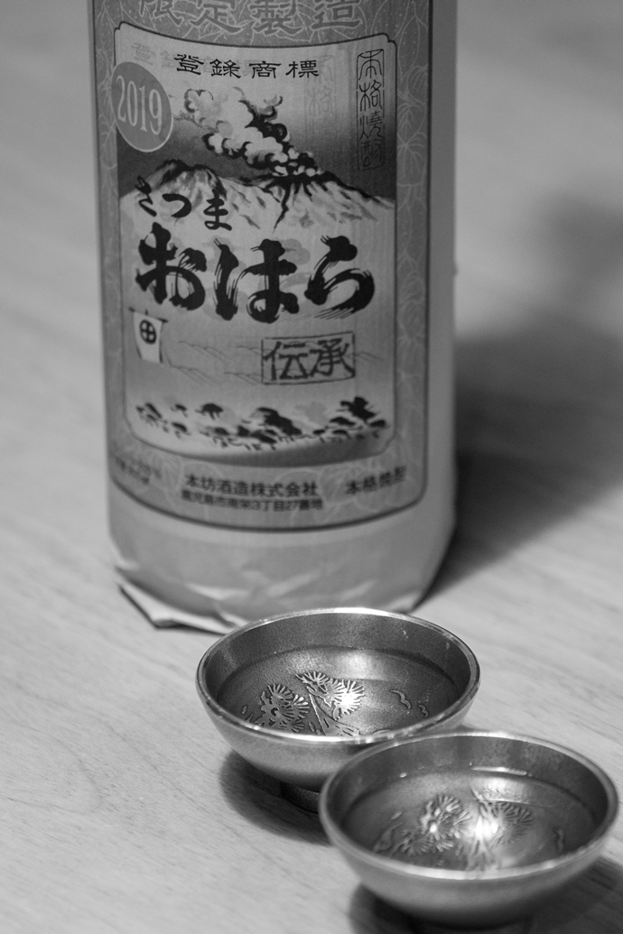 冬に数量限定で販売される「伝承 さつまおはらにごり」は、昭和時代に製造されていた製法を用い、蒸留後に濾過を行わずに仕上げているため、通常では取り除く油分も残っており、香味ともに濃厚でうっすらと白濁した焼酎です。その白濁をしっかり見てとれるように透明瓶に入っています。